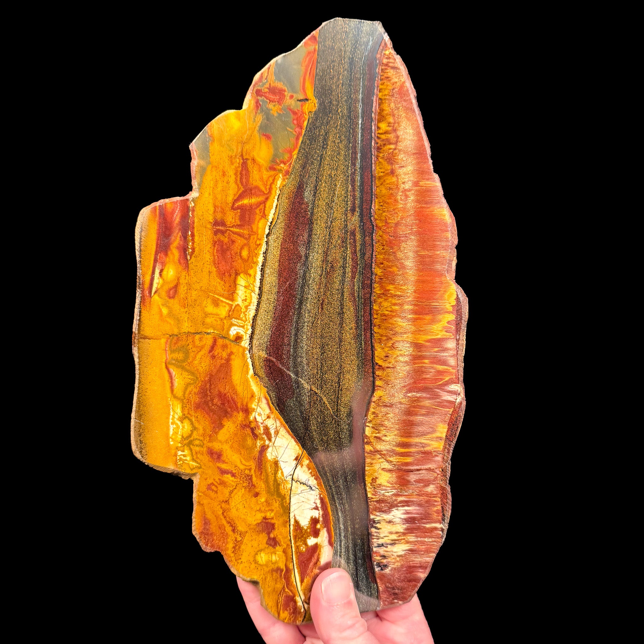 Formed during the Archean Eon, (Archean from the greek meaning “beginning” or “origin” for the first start of life), it is believed that the Earth resembled a water world, with most of the continental crust hiding under a very deep ocean. The atmosphere lacked free oxygen, so when the first micro-organisms (cyanobacteria) photosynthesized, it greatly increased the oxygen content in the oceans. Banded Tiger Iron slabs are believed to be derived in part from the remains of these micro-organisms.