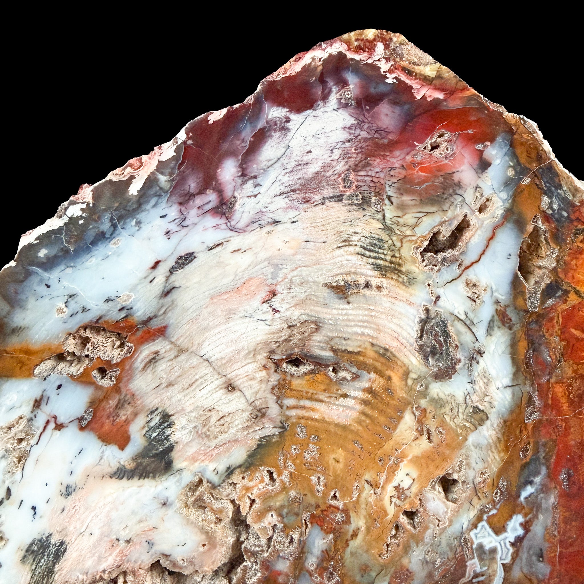 Petrified wood forms when a tree falls and is rapidly buried by sediment such as volcanic ash or river sediments. This creates a reduced oxygen environment (anaerobic) which halts the usual decay process. Minerals carried through the flow of water and absorbed into the tree slowly began to replace the organic material and crystallize. Over hundreds and thousands of years this crystallization took place hardening into stone. Composed mostly of silica (quartz), small concentrations of other elements including iron, create the rich color variations seen here.