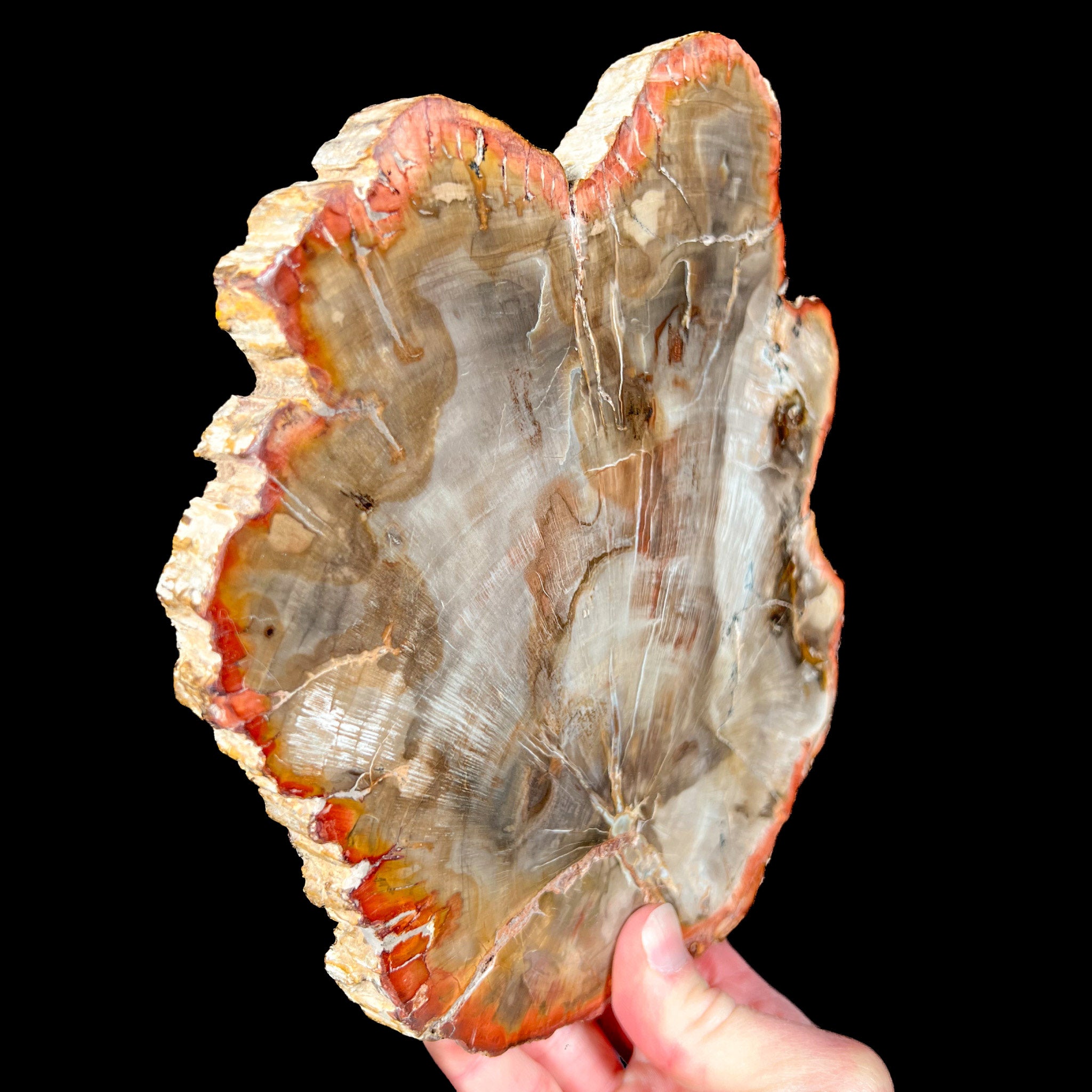 Petrified wood forms when a tree falls and is rapidly buried by sediment such as volcanic ash or river sediments. This creates a reduced oxygen environment (anaerobic) which halts the decay process. Minerals carried through the flow of water and absorbed into the tree slowly began to replace the organic material and crystallize. Over hundreds and thousands of years this crystallization took place hardening into stone. This petrified wood fossil is dated at approximately 225 million years old.