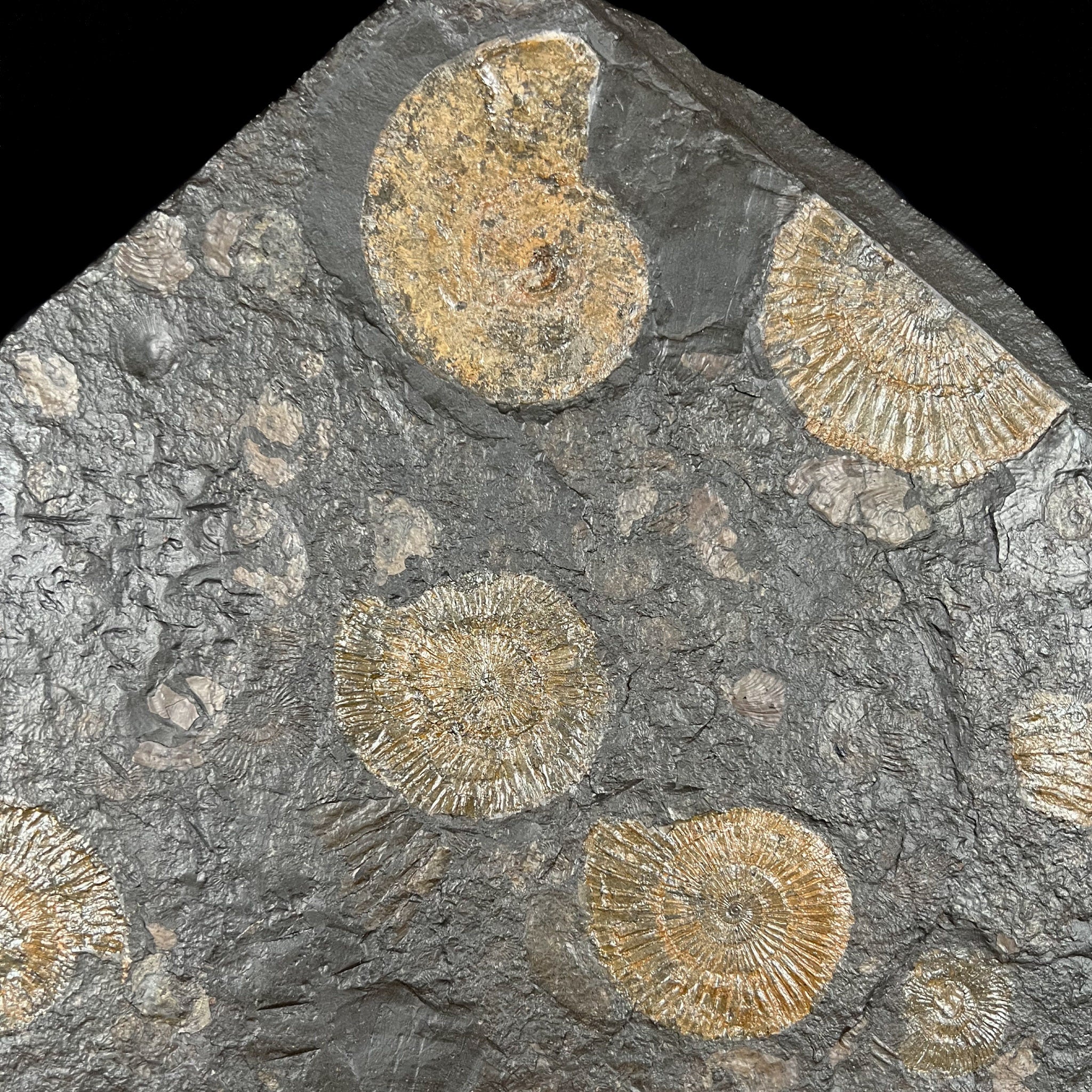Ammonites are an extinct group of sea creatures which thrived during the Jurassic Period approximately 180 million years ago. This plate has many Ammonites of the species Dactylioceras. The Ammonites have naturally mineralized with a beautiful pyrite coating giving it a rich brass color which contrasts nicely against the dark shale background. The matrix contains many other smaller Ammonite fossils surrounding the main fossil.