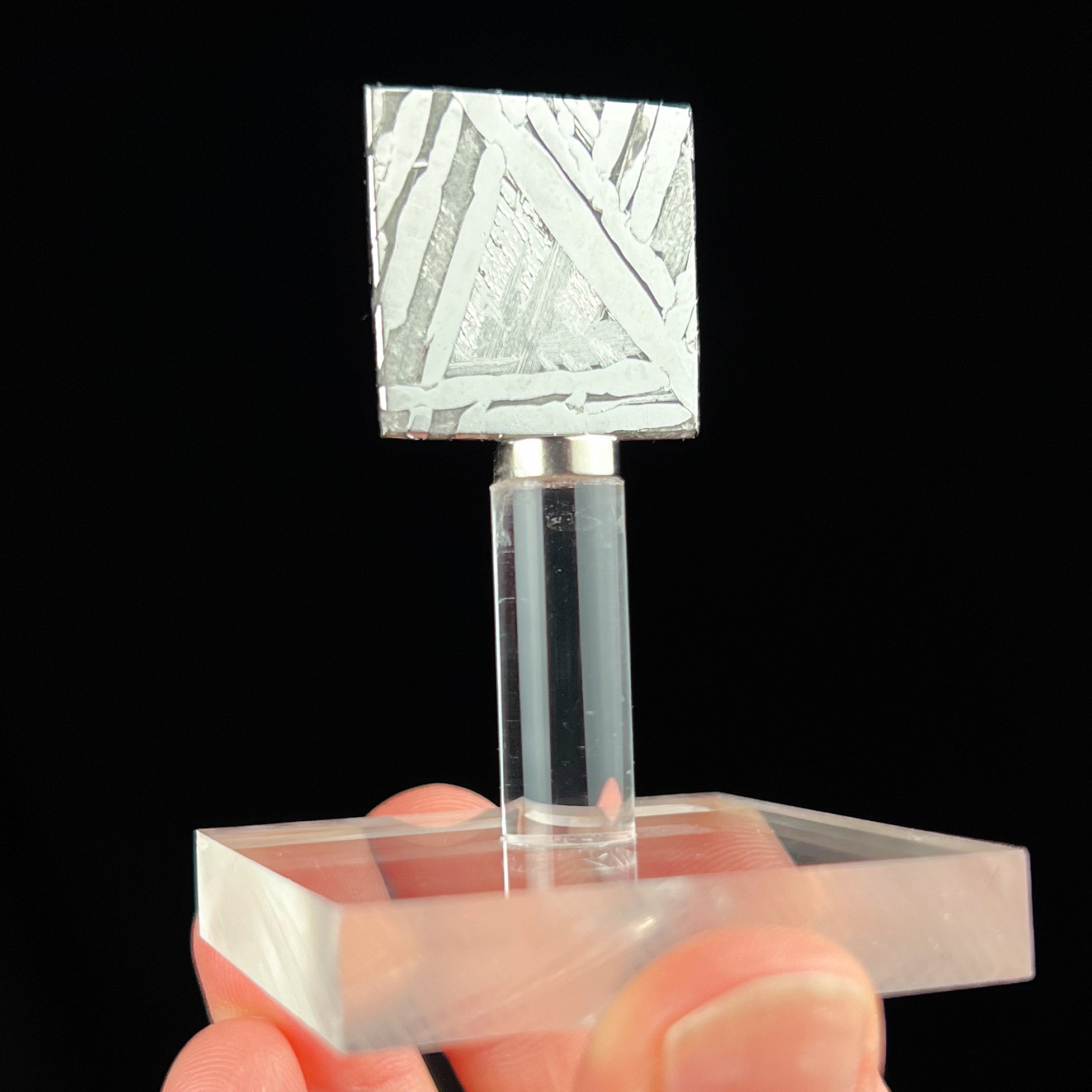 The intricate criss-crossing patterns called Widmanstatten formations or Thomson structures are figures of long nickel-iron crystals found in some, but not all, meteorites. It is a mixture of interweaving Kamacite (native iron!) and Taenite bands or ribbons called lamellae. It is believed extremely slow cooling (potentially millions of years) allowed these metal alloys to form this intricate inter-growth. This specimen also contains Schreibersite inclusions. The pattern is further revealed when certain meteorites are cut, polished and acid-etched.